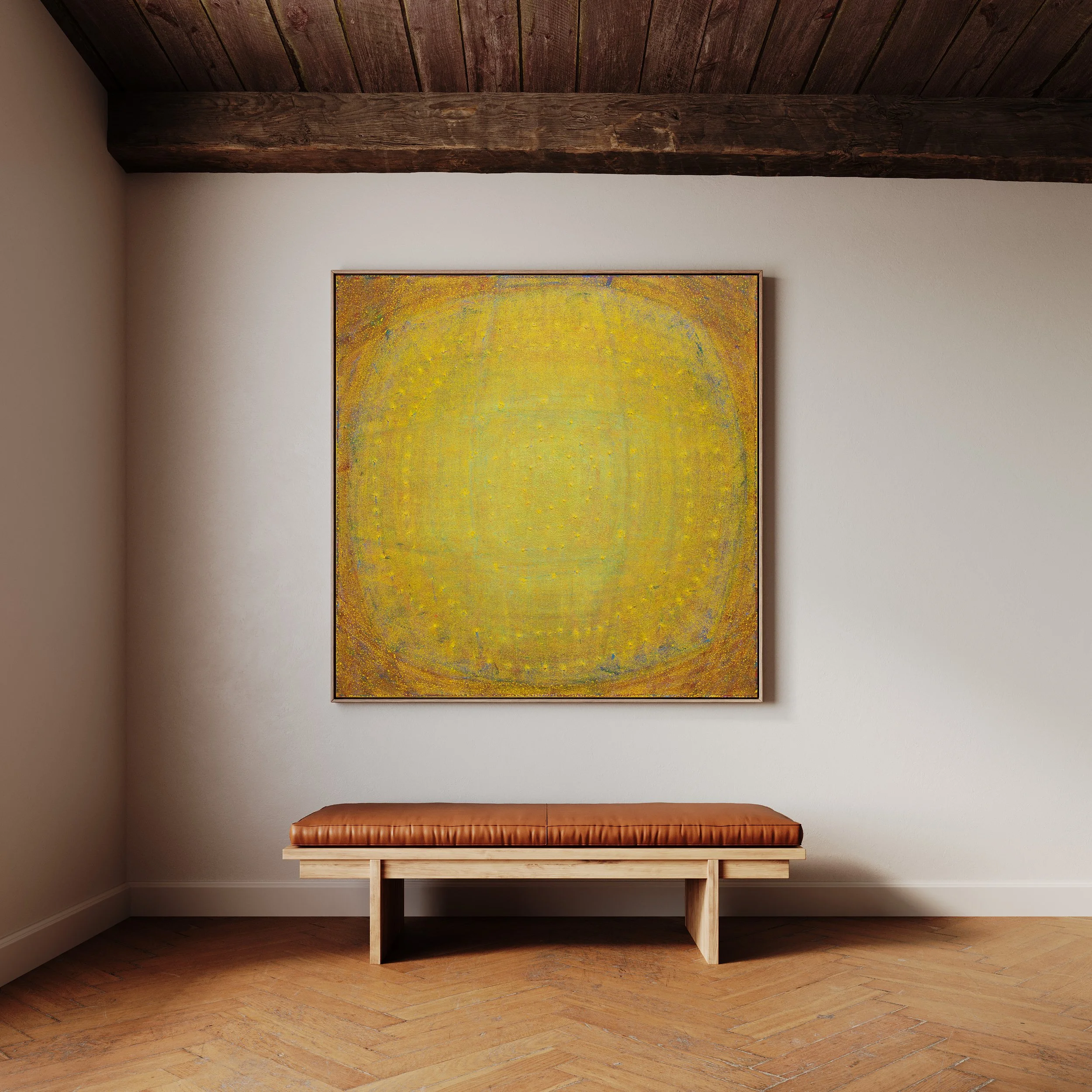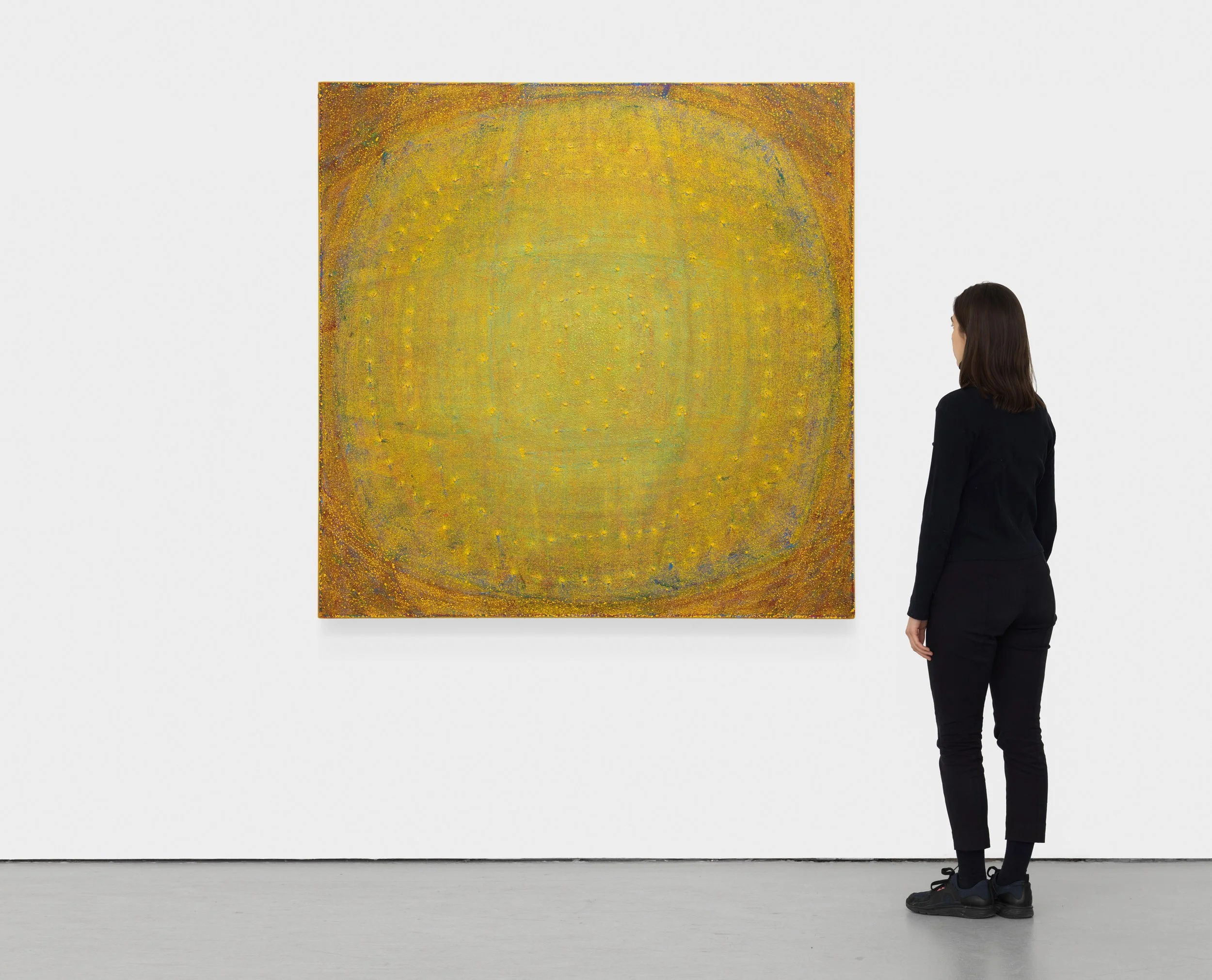 Rooted in themes of sun worship and connection to vitality, the painting’s vibrant hues and concentric oval patterns echo the ancient monument of Woodhenge in Wiltshire. Built to align with the summer solstice sunrise, this Neolithic structure is believed to honour the living. Similarly, Land of the Living bridges the viewer to a continuum of existence, connecting all who breathe in and out—both those present and those across the expanse of time.